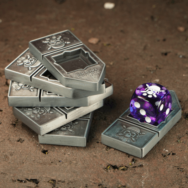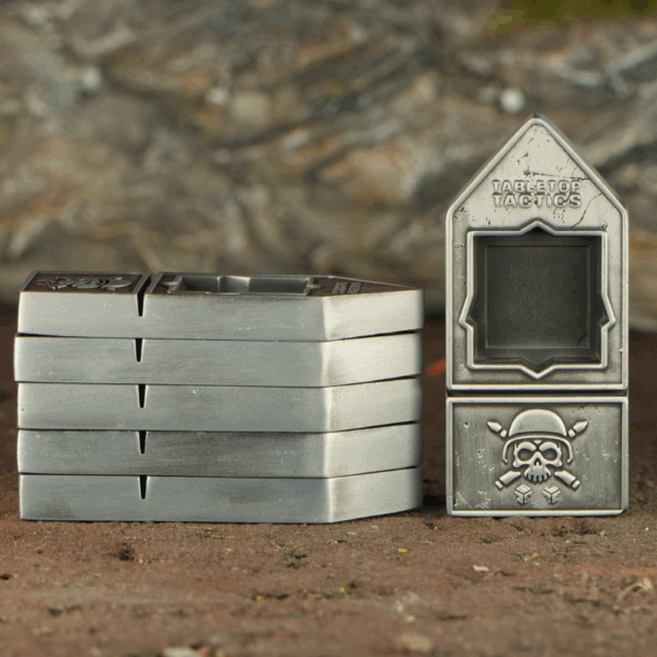 This set of 6 nickel gaming counters is engineered for players who like to keep their tabletop as sharp as their strategy. Each counter features a recessed tray perfectly sized for 16mm or 12mm dice — ideal for tracking wounds, objectives, or command points. They can also hold a D20, D12 or D10 for higher number tracking. A built-in card slot lets you display stratagems, powers, or buffs with clarity and ease. Durable, weighty, and distinctly refined — the perfect tools for a commander of the far future. Comes with a small bag.
